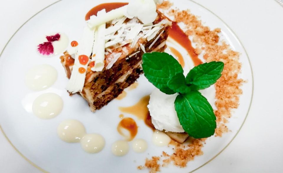 • Carrot cake con mermelada de naranja, salsa toffee y helado de caramelo salado