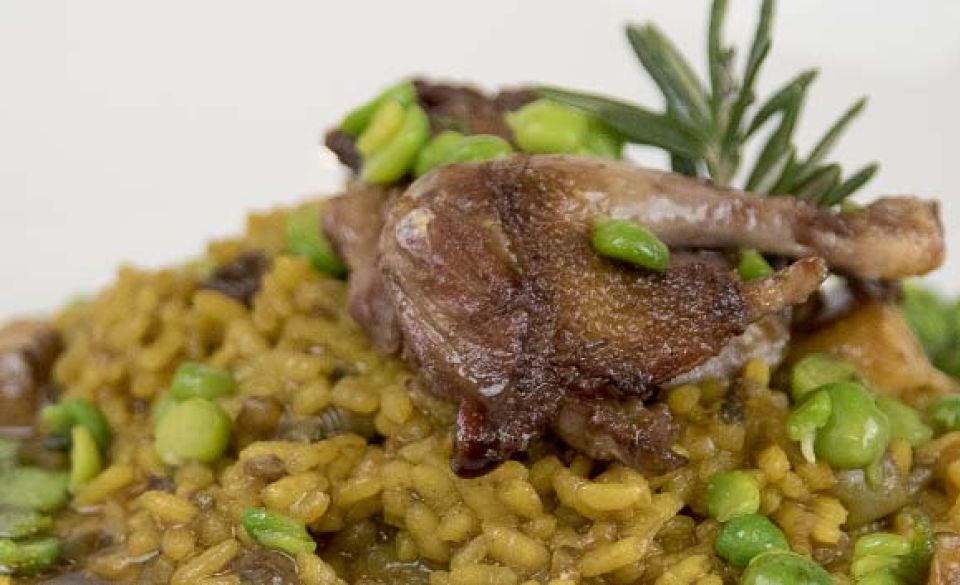 • Arroz de pichón con caracoles de montaña, setas y verduras.