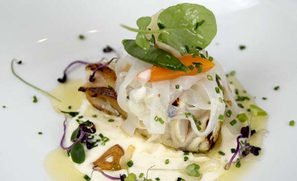 Lubina de playa asada a la parrilla con tallarines de calamar y crema de puerro.